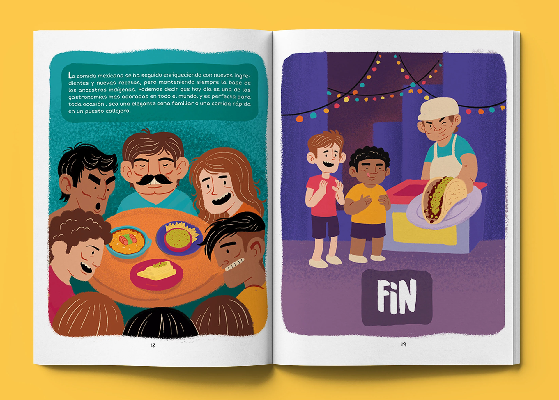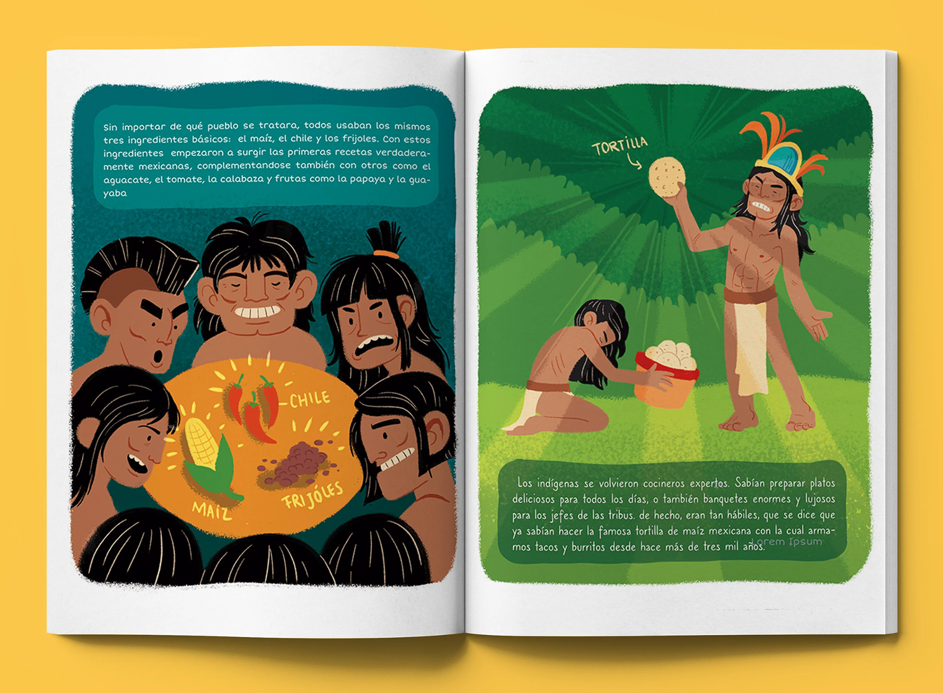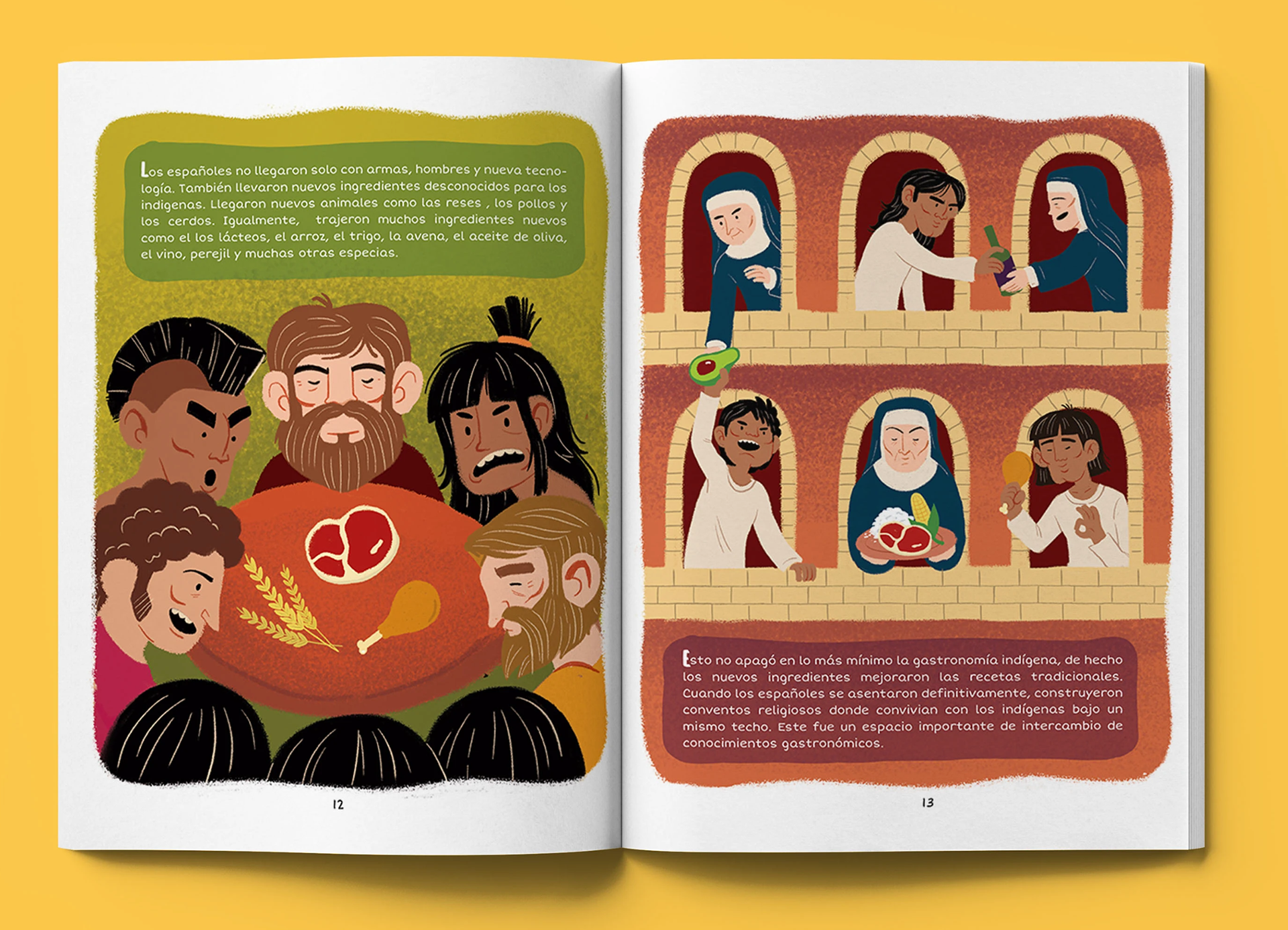 The goal of this project was to teach the history of Mexican gastronomy to children. The story developed from three major historical periods : the pre-colonial, the Spanish viceroyalty and the present. For each stage a color palette and a different tone were defined. In addition, it was sought to show how the relationships between Indigenous and Spanish people slowly resulted in present day Mexico's ethnic diversity.
