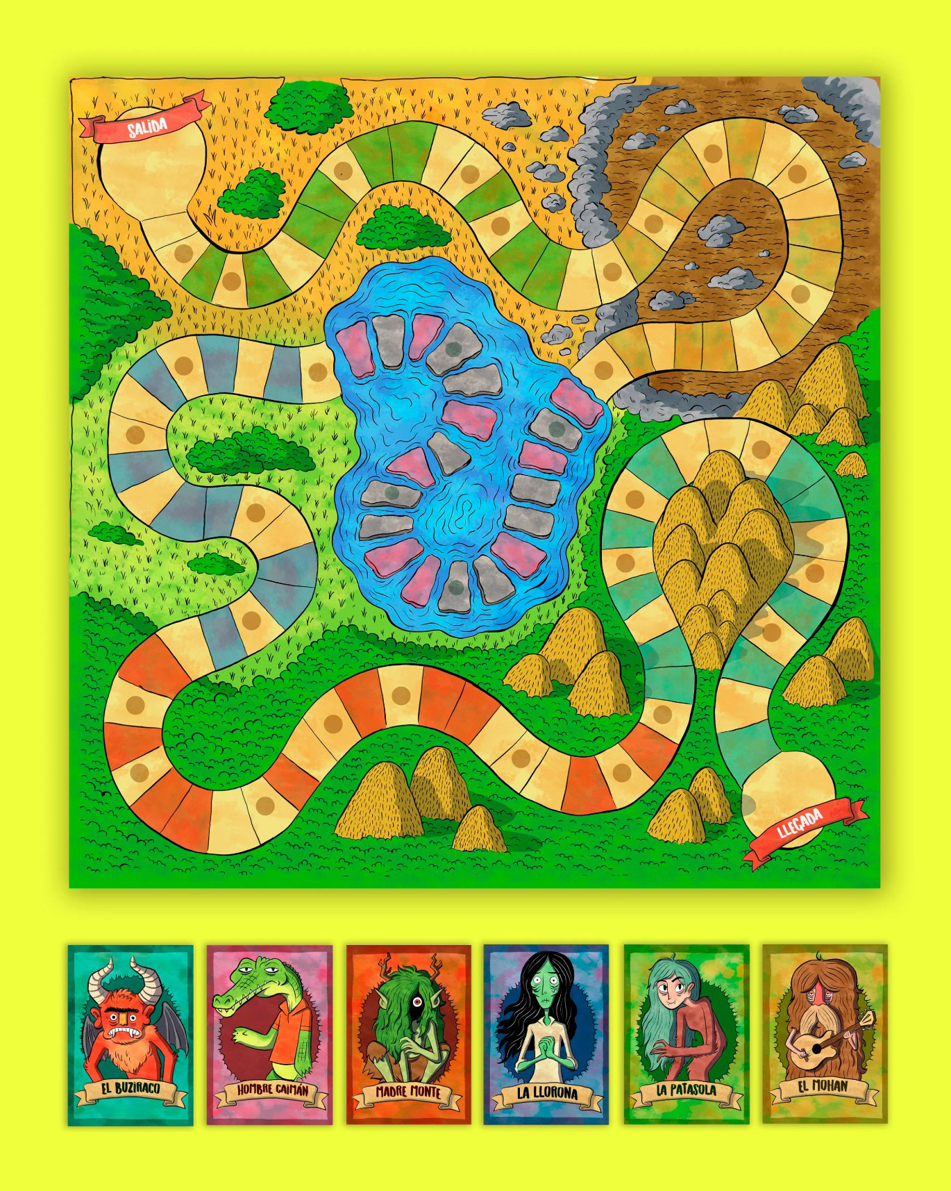 El Camino del Chamán (Road of the Shaman) is an educational board game created for a low-income primary school in Cali, Colombia. Its goal is to teach students about Colombian myths and legends in a fun, engaging way. The story follows a group of young Indigenous boys who journey across the wild to become warriors, encountering creatures from Colombian folklore along the way.
