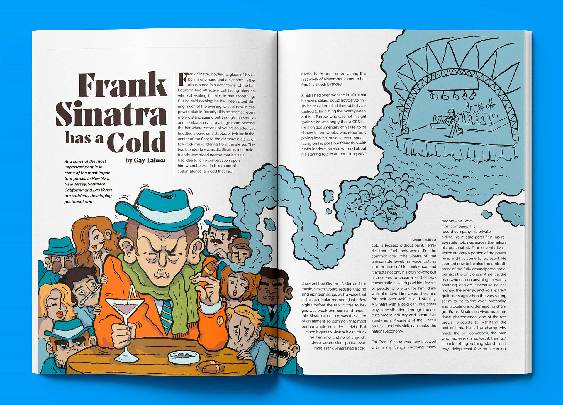 "Frank Sinatra has a Cold", a profile written by Gay Talese in 1966 tells the story of how Sinatra's day was ruined by a cold. It's considered one of the greatest pieces of journalism ever written. It's narrative style, much more smilar to fiction literature, inspired me to illustrate it's first paragraphs. I played a lot with the composition and the text to achieve a cool, dynamic spread. I also tried to capture the comedic tone of the story.