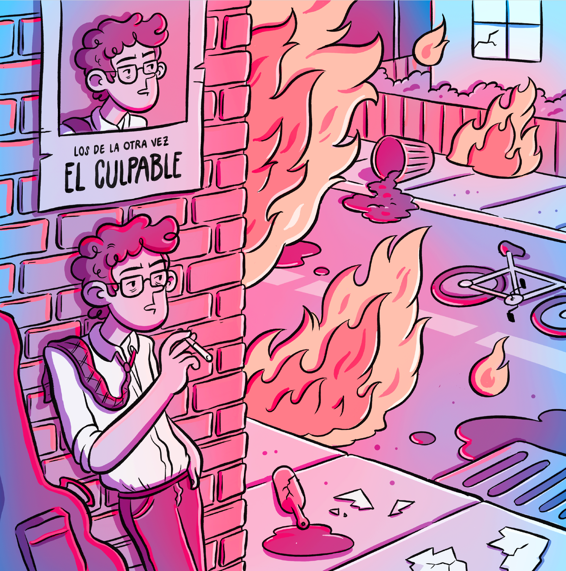 A few months after releasing El Culpable, it was time for the next single, Queremos—a political song about inequality and injustice in Colombia. I illustrated the aftermath of a protest, tying it to El Culpable by keeping the same setting and even adding the man’s tie.