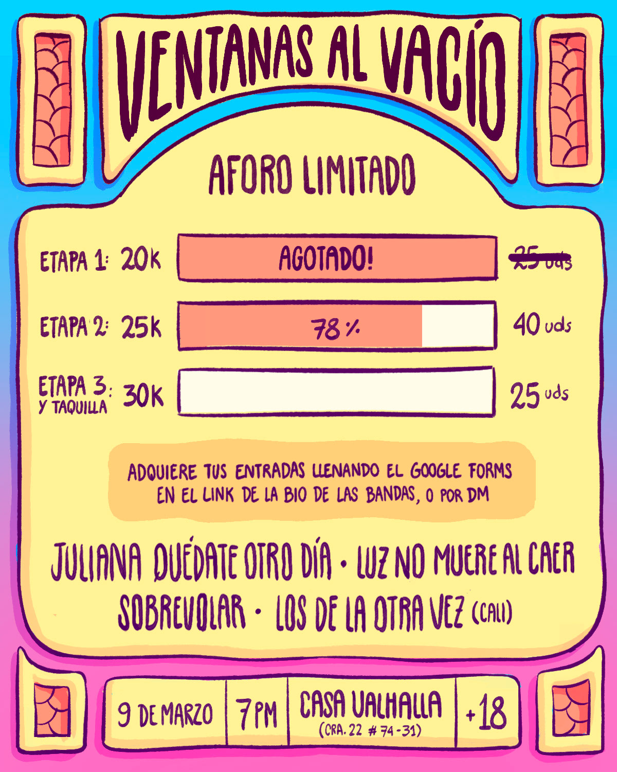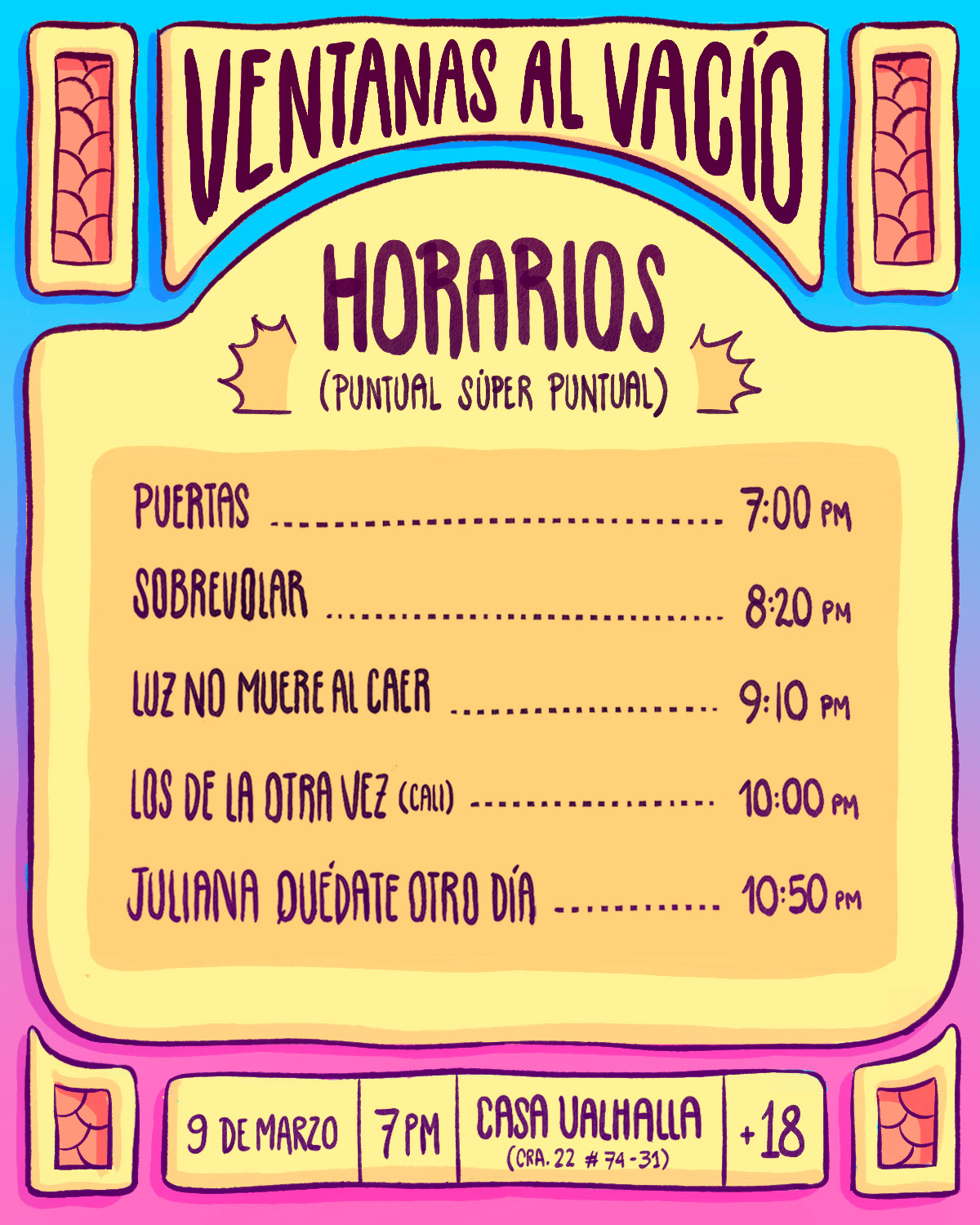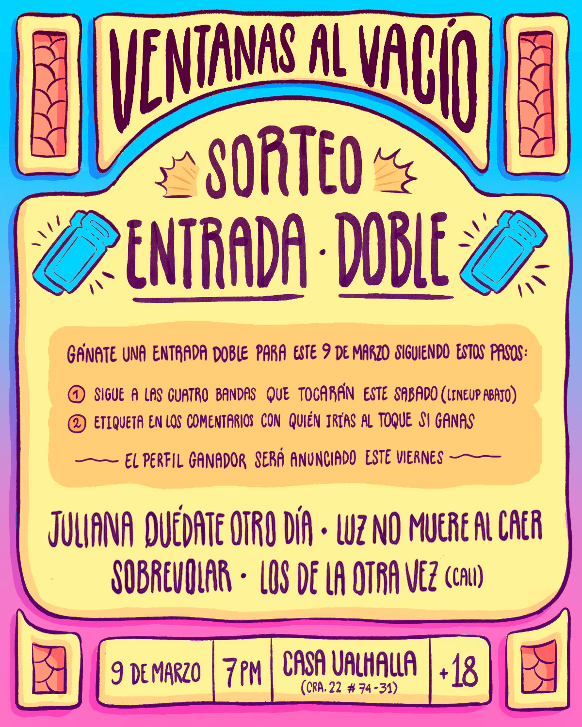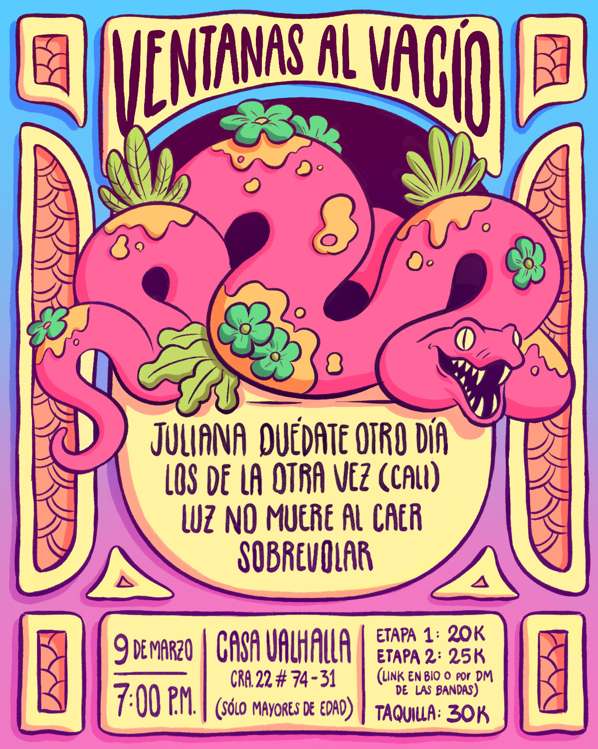 Ventanas al Vacío (Vacuum Windows) was an indie rock concert in Bogotá. I was asked to design the flyer and artwork for the social media campaign. With full creative freedom, I came up with the name and built the concept from there. I wanted to capture the energetic, underground, and youthful vibe of the bands while keeping a tropical Latin touch.